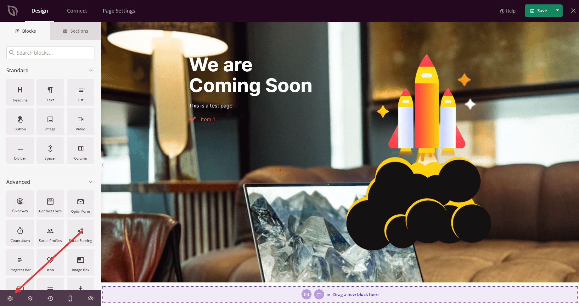 1. On the Page Builder bottom right side, find the gear icon that represents Global Settings